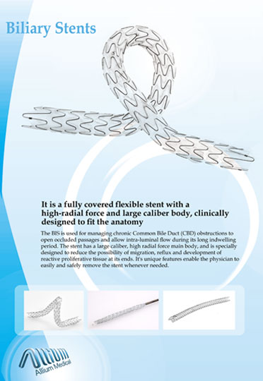 The Allium self-expandable, large caliber, fully covered and easily removable biliary stents were designed to be used in chronic Common Bile Duct (CBD) obstructions in order to allow excellent intra-luminal flow during its long indwelling period (of up to 3 years). The Stents are made of a super-elastic metallic alloy (nitinol), which is fully covered by a unique and proprietary polymeric material in order to prevent tissue in growth and reduce occlusion by bile sludge.